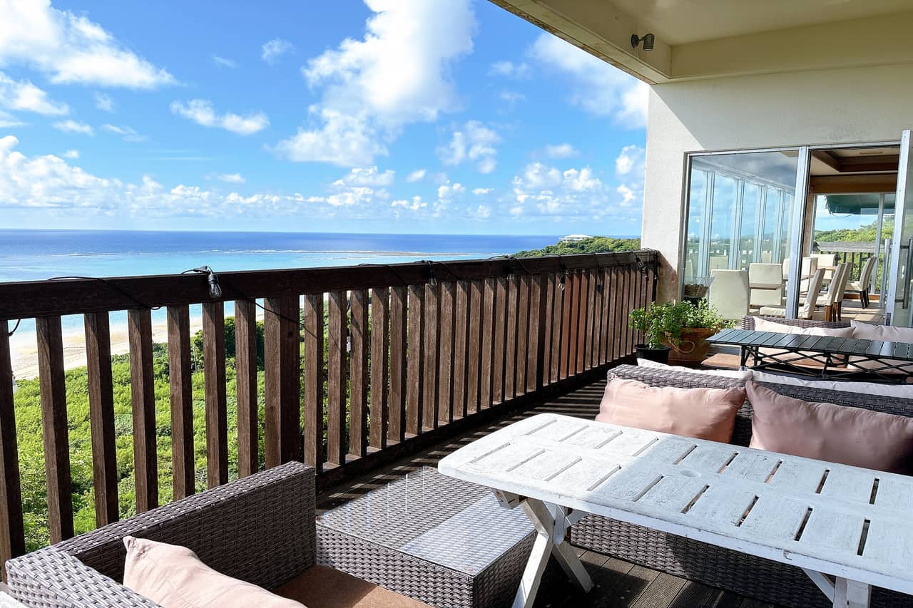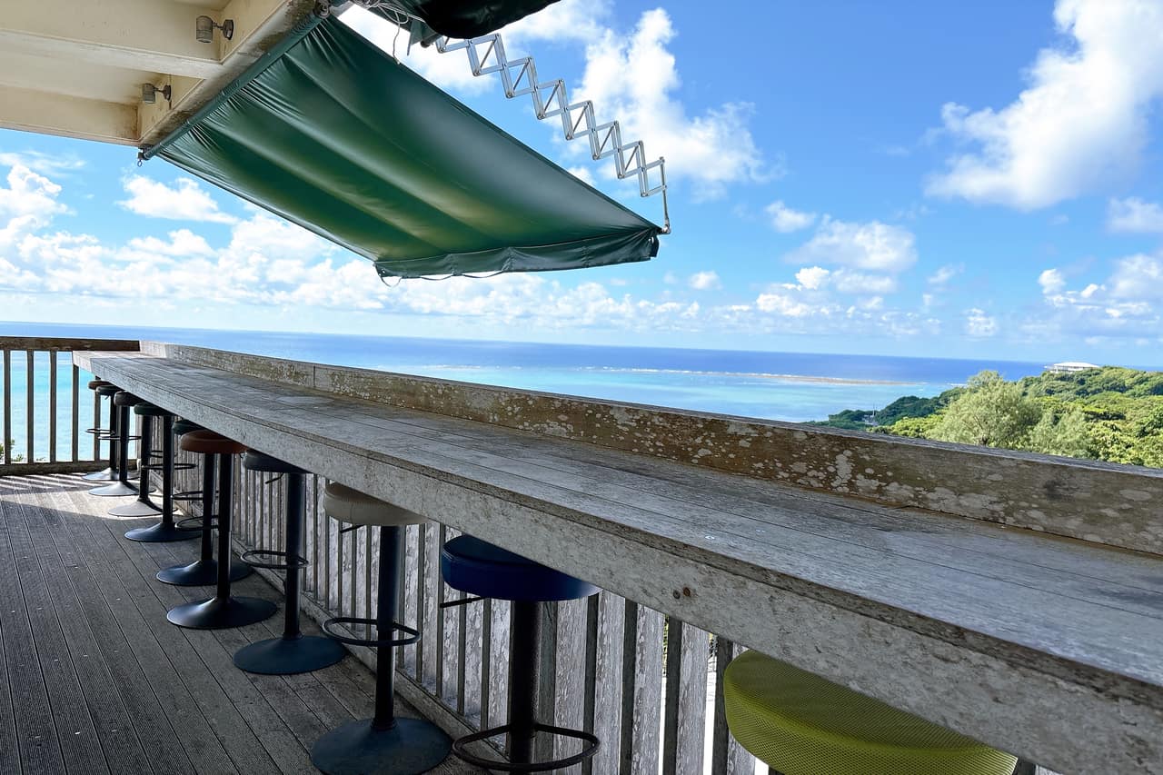 テラス席では、南城市を吹き抜ける風と沖縄の太陽の光を全身で感じながら過ごせるひととき。店内からの眺めよりもさらに鮮やかで、澄み切った青が目の前に広がります。