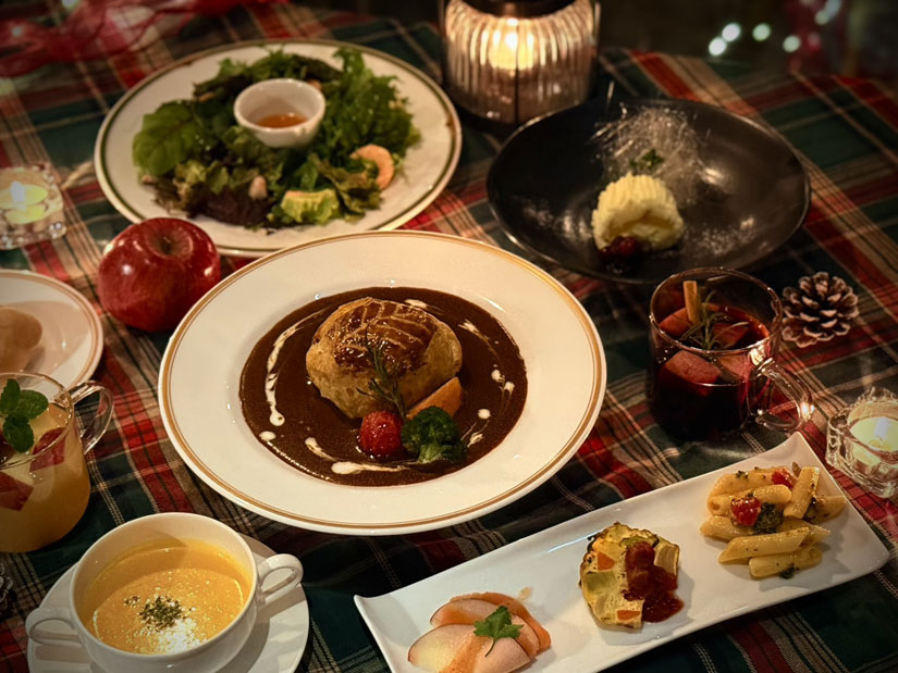 期間中は、施設内の「森の駅Daizahoushi」でこの季節ならではのクリスマスディナーが提供されます。地元の恵みを活かして、それぞれの食材の魅力を丁寧に引き出した特別な味わいが楽しめるコース料理です。要予約。