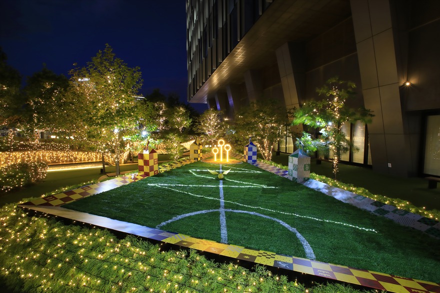 空中庭園の中央には、魔法界の人気スポーツ「クィディッチの競技場」をイメージした装飾が登場!フィールドでは、LEDライトで金のスニッチが飛んでいるかのように表現しています。