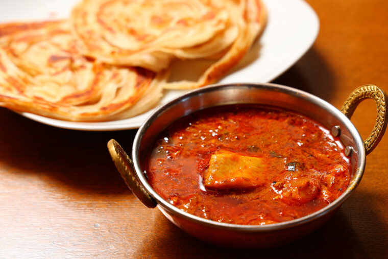 上写真は『南インド風魚のカレー』。酸味のあるタマリンドペーストとスパイスを用いたカレーの中には、やわらかく弾力のあるナマズの白身が! サクサク食感の南インドのパン『パラータ』(560円)と一緒にどうぞ。