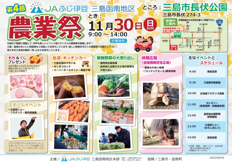 長伏公園に三島・函南の「うまいもの」が大集結する農業祭です。新鮮な農産物や加工食品、キッチンカーが出店し、JAによるアツアツの焼き芋も販売。購入者特典の餅とくじの配布、動物とのふれあい、大道芸ステージなど、家族連れで一日楽しめます。