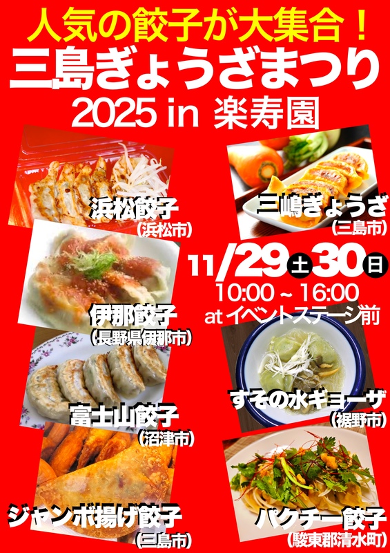 三島市立楽寿園で現在開催中の「菊まつり」に合わせ、恒例の餃子まつりを開催。地元の三嶋餃子や富士山餃子のほか、浜松餃子、すその水ギョーザ、伊那餃子など、地域で愛される餃子を一堂に食べ比べできます。音楽ステージや「こども秋まつり」とのコラボもあり、親子で楽しめます。