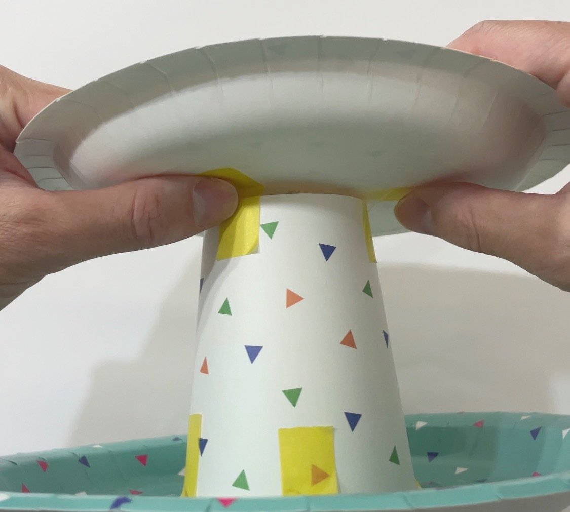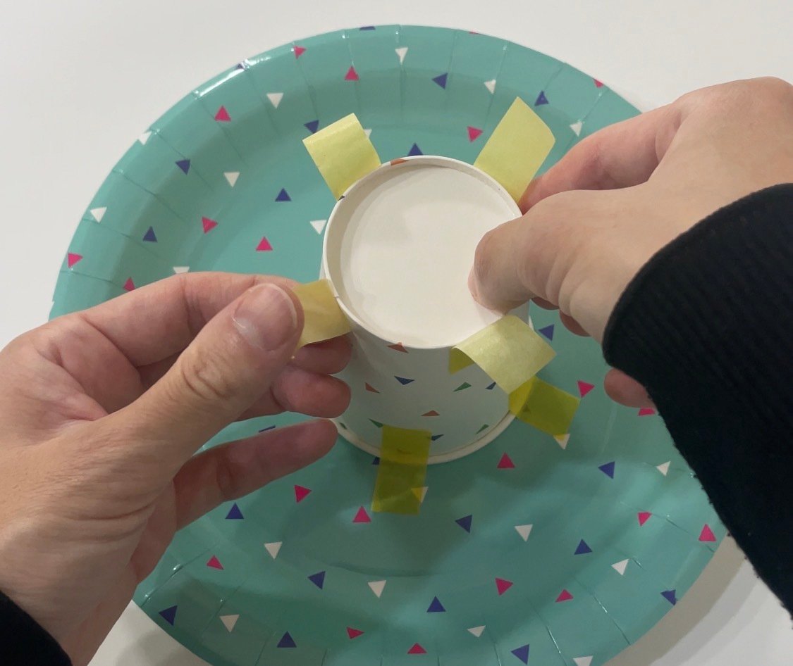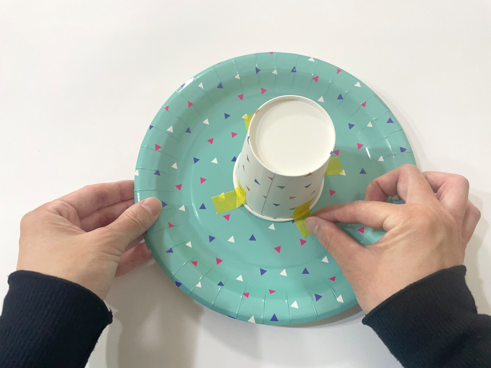 2.紙コップの上部にマスキングテープを4か所貼り、その上に小さいサイズの紙皿を置きます。裏返してしっかり固定してください。