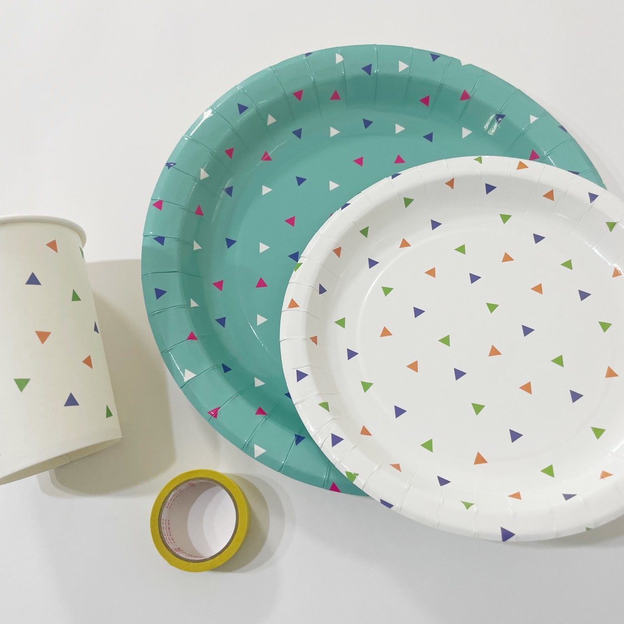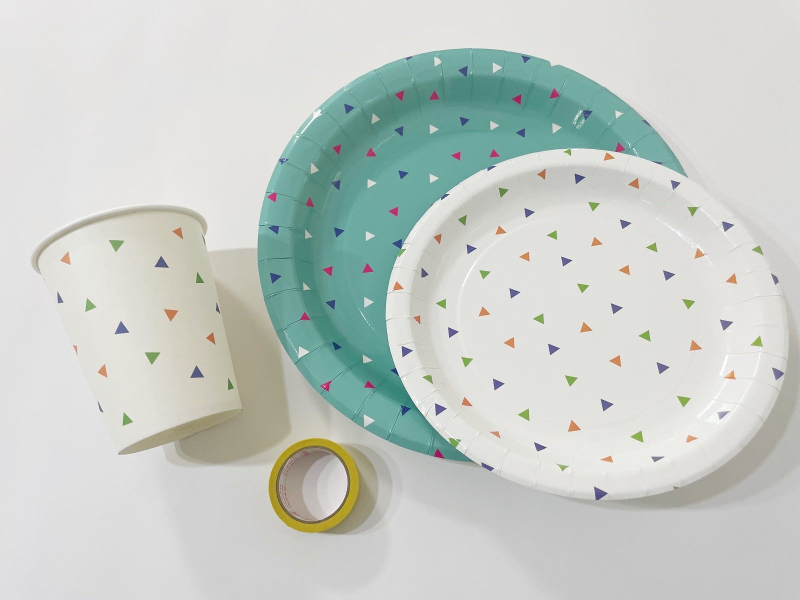 用意するものは、紙皿2枚、紙コップ1個、マスキングテープです。紙皿は、上段にくるものを少し小さめにするとバランスがよくなります。サイズの違う紙皿を組み合わせるのがおすすめです。