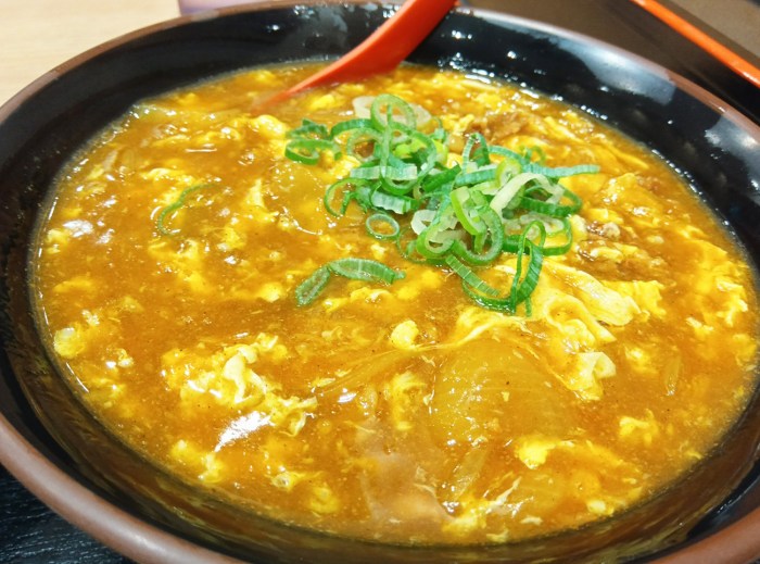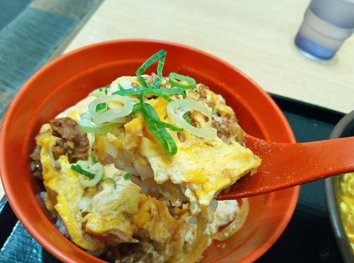 そもそもカレーそばに玉子と牛肉が入ってるって関東ではあまり見かけない気がするので、豪華さの方向もならではと言える。で、ならではと言えば、親子丼の肉が牛肉の「牛ふわっ玉丼(税込680円)」も割とならでは。関西で言う他人丼だ。