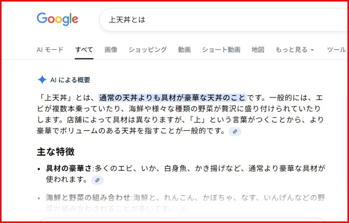 やはり上オーラはない。念のため、上天丼の定義を調べてみたところ、GoogleのAIによると「通常の天丼よりも具材が豪華な天丼のこと」とのこと。ちなみに、都そばに天丼はない。上天丼の概念に疑問を投げかけずにはいられない上天丼である。