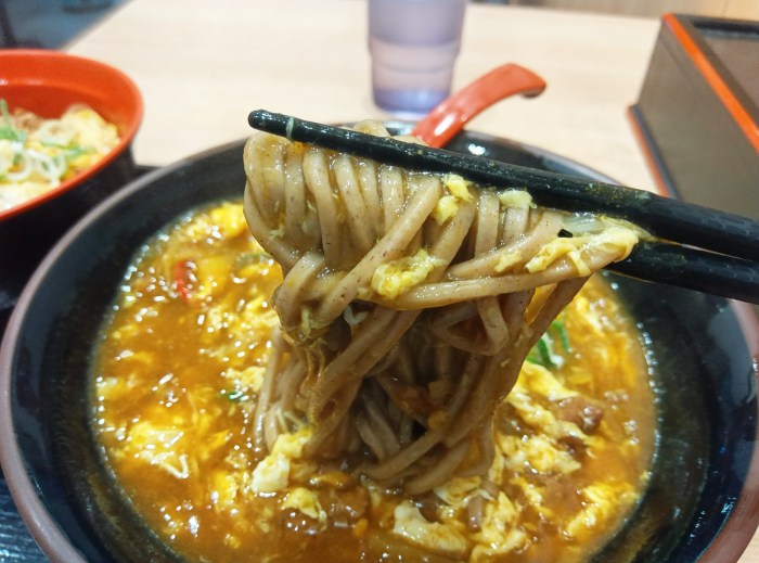そんな『都そば』だけど、もちろん全部のメニューが上オーラがないわけではない。例えば、「カレーそば(税込780円)」は牛玉入りでちょっと贅沢。都そばのそばはふにゃっとした麺で、つゆは醤油控えめで昆布出汁メインなのでカレーそばの味もちょっと違う。