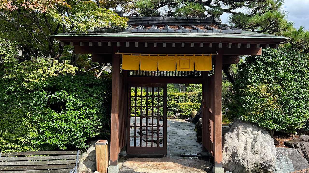 広い駐車場を挟んで格子の門、その向こうには立派な日本庭園が広がっています。