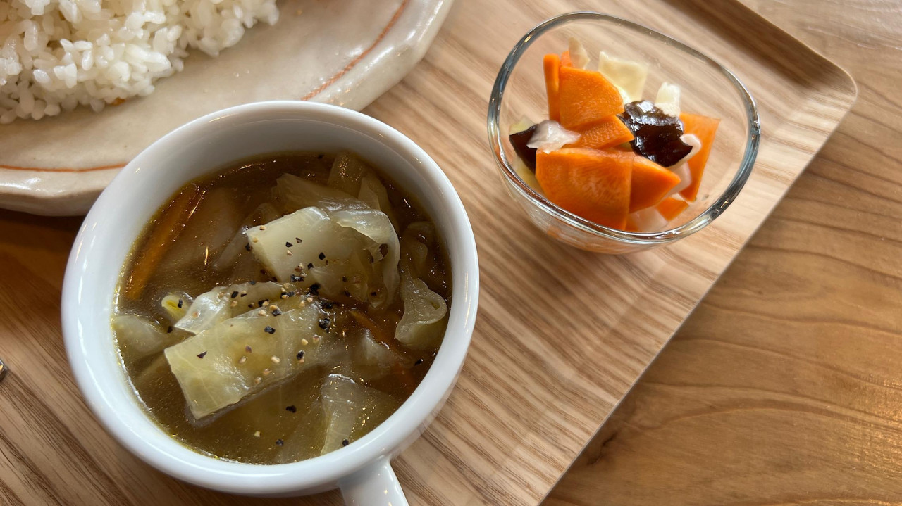玉ねぎなどの野菜をたっぷり使って無水調理でつくるスパイスカレーに、具だくさんスープと小鉢のピクルスがセットになっています。