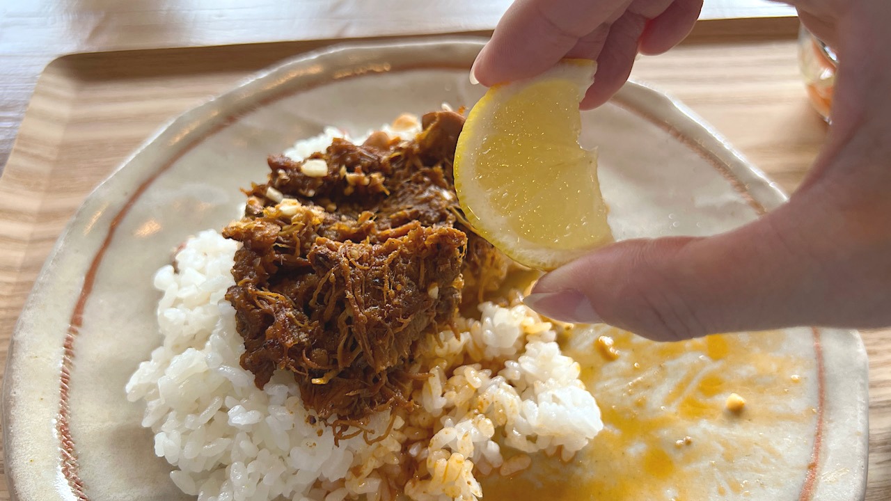 食べやすいカレーですが、食べ続けるうちにもったりと感じてきたら、添えられたレモンをしぼるのがオススメなんだだそう。