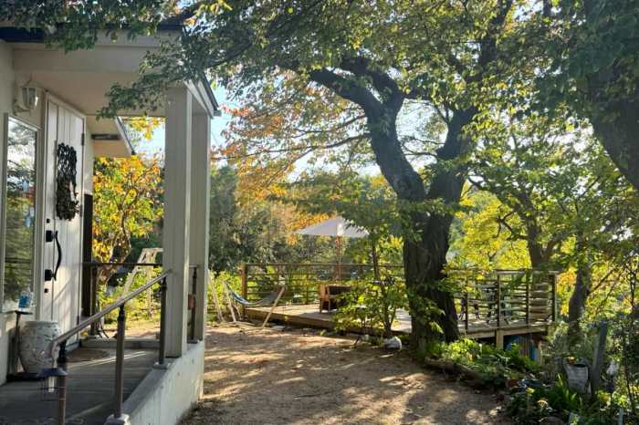 店名の由来である青い瓦屋根の可愛いお家が、カフェ『aoie』です。お店の前にはシンボルツリーのエノキの大木。その奥側には開放的なテラス席があります。