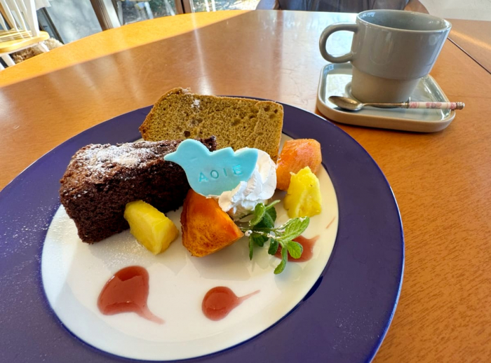 ケーキの種類は季節限定&日替わり。この日は、抹茶シフォンとガトーショコラを、セットで頂きました。ふんわりとした口当たりのシフォンに、穏やかな甘さが嬉しいガトーショコラ。柿は奈良・吉野産の富有柿です。