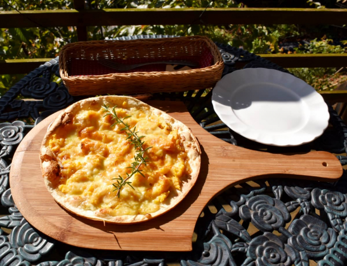 こちらは「安納芋のピザ」。自家菜園で収穫した安納芋を、2種のチーズと隠し味のいちじくジャムで、個性的なデザートピザに仕上げました。お芋のホクホク食感と優しい甘さが、チーズの風味と生地の香ばしさで際立ちます。