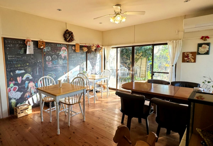大きな窓からたっぷりと陽射しが入る店内。磨き上げられた床の、木の温かみが心地よい雰囲気を醸し出しています。奥の黒板には、お客さまからの心温まるメッセージがぎっしり!