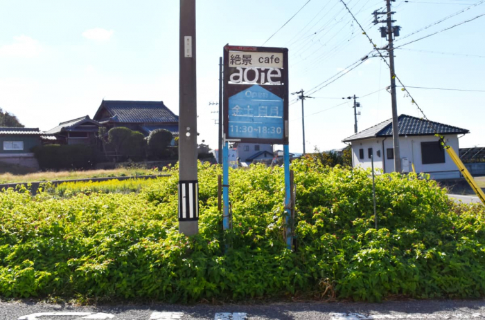 県道31号線、別名「サンセットライン」から、写真左側に見えるお洒落なデザインの標識を辿って坂を登ると、『aoie』まではほぼ一本道。