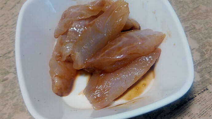 刺し身にしたあとは軽く塩を振り、冷蔵庫内に少し置く。時間にすると、20~30分。魚の表面に水分が出てくれば完成。あとは水気をキッチンペーパーで拭き取ればできあがり。シンプルだが、魚のうま味がグンと増す。