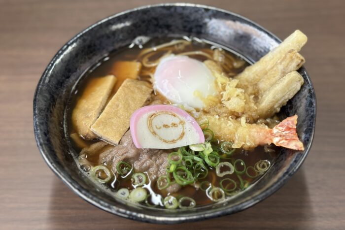 きつね、ごぼ天、牛肉、海老天、温玉、かまぼこ、天かす、ねぎなど様々なトッピングが乗って税込1000円というお値打ち価格。