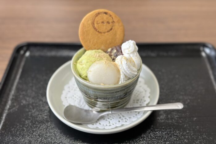 抹茶とバニラのアイス、白玉、あんこを合わせた和風パフェ。程よいボリューム感で重すぎないので、食後のオーダーもおすすめ。