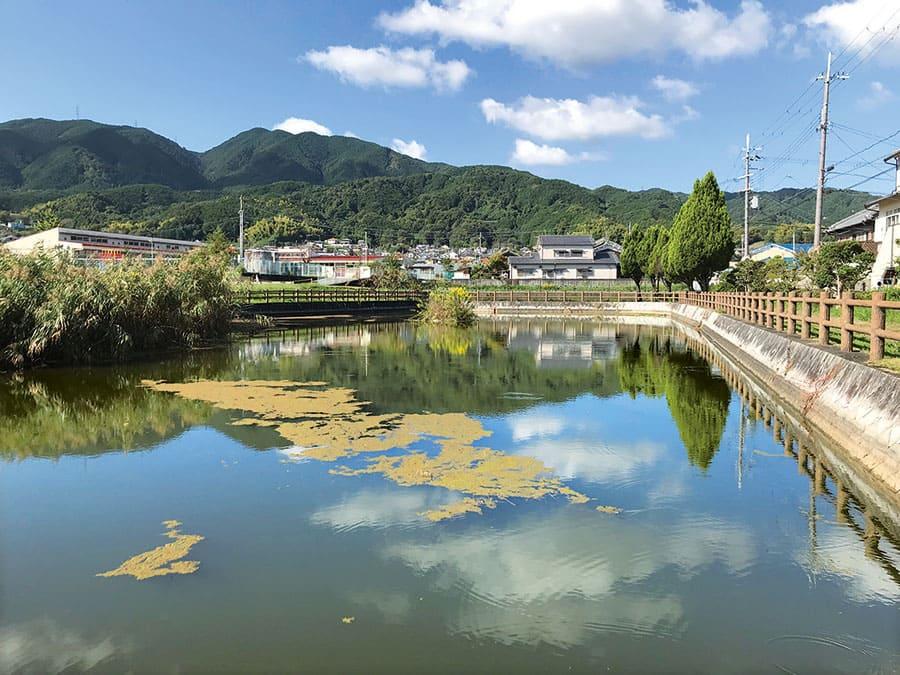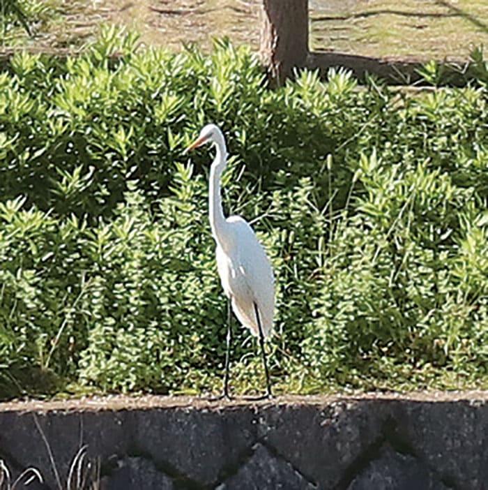 ぷらぷら歩いていると池のある公園を発見。池のベンチでは、のどかで平和な時間が流れ、白サギも休憩中♪ 水面に映る山と雲をパシャ。