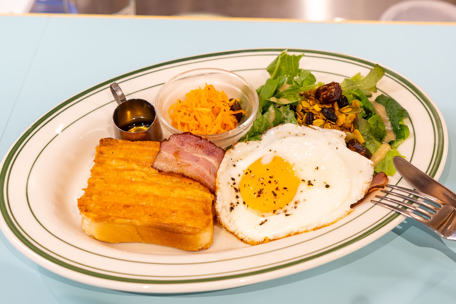 UPLIFTプレートは、メイプルシロップのチーズトーストかバタートーストを選んで、目玉焼き、ベーコン、キャロットラペ、特製グラノーラをトッピングしたサラダが添えられてワンプレートで提供される。