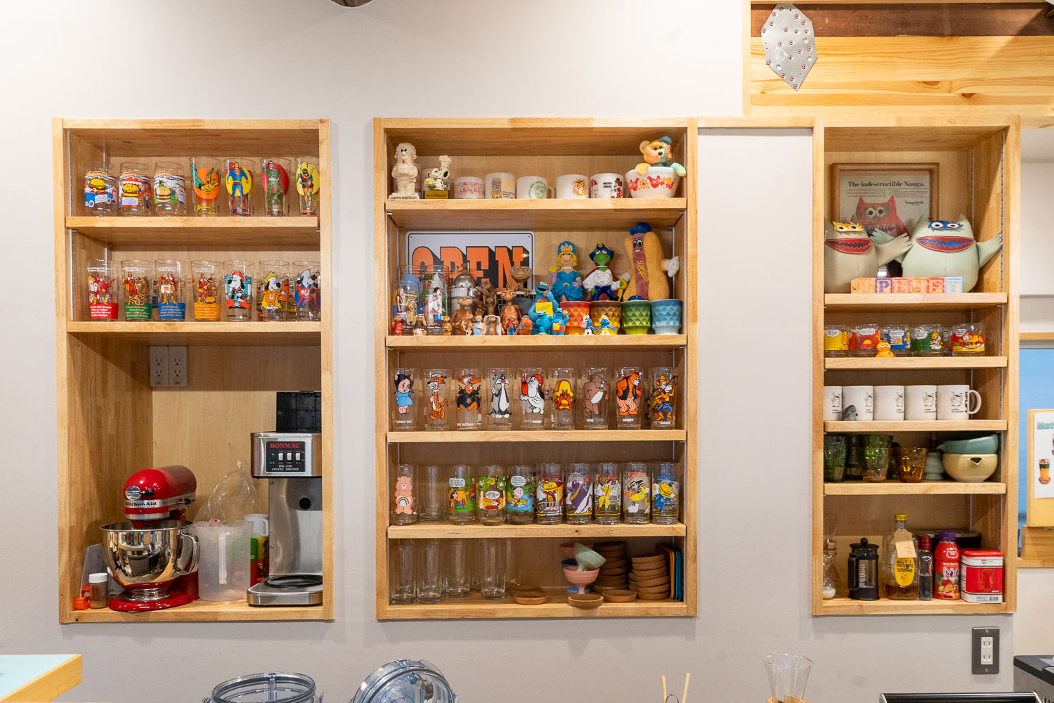 店内を見回すと気がつくのは、アメリカンなグラスがカウンター後ろにずらっと並んでいること。これは有希さんのコレクションで、やはり高円寺でアメリカンビンテージ・グラスを扱うショップ『ディーラーシップ』で買い集めたもの。オレンジジュースや、ハワイのジュースPOG(パッションフルーツ、オレンジ、グアバをブレンドしたトロピカルジュース)を再現したドリンクなどは、このグラスで提供している。また人気の抹茶ドリンクは、高円寺でお茶を教える先生に抹茶の点(た)て方を習った。