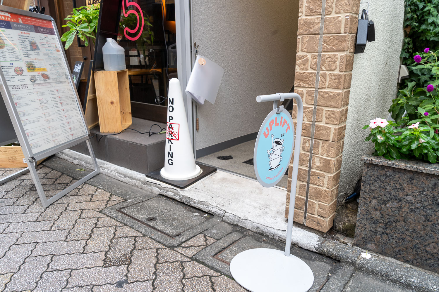 高円寺駅北側の庚申通り商店街にオープンした『UPLIFT coffee&breakfast』。お店の入り口はビルの2階にあり、入り口につながる階段の前に小さな看板が控え目に立てられている。建物にある通路の壁に、かつてこの場所にあった「田中金物」の写真が飾られている。『UPLIFT coffee&breakfast』は「田中金物」の家族が約20年ぶりに、この場所で開いたお店なのだ。