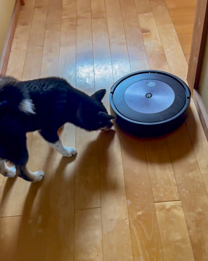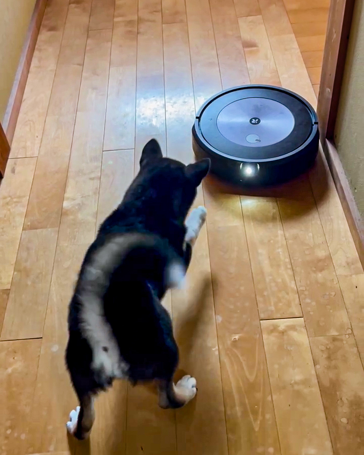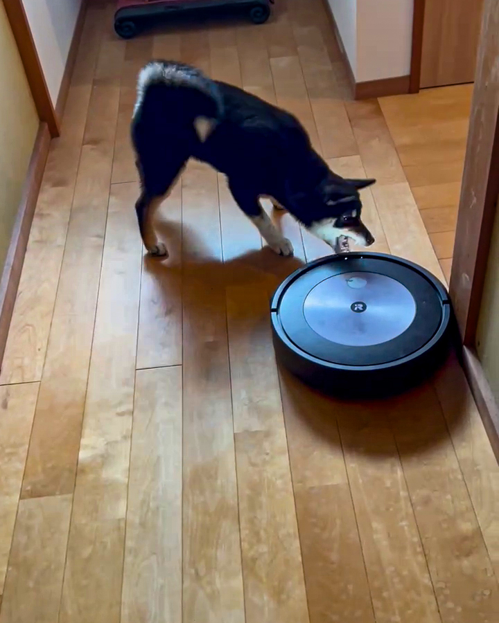 「怪しい奴がいます!」ロボット掃除機と犬の可愛い対戦!?思わず応援したくなる微笑ましい姿【犬の日企画】