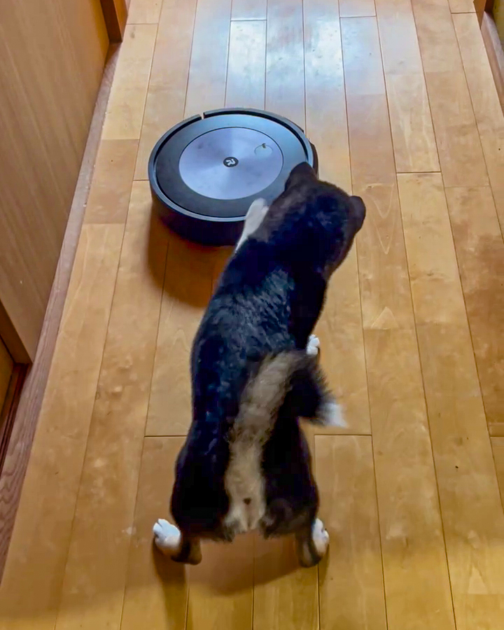 まさにあんこちゃんvsロボット掃除機です(笑)