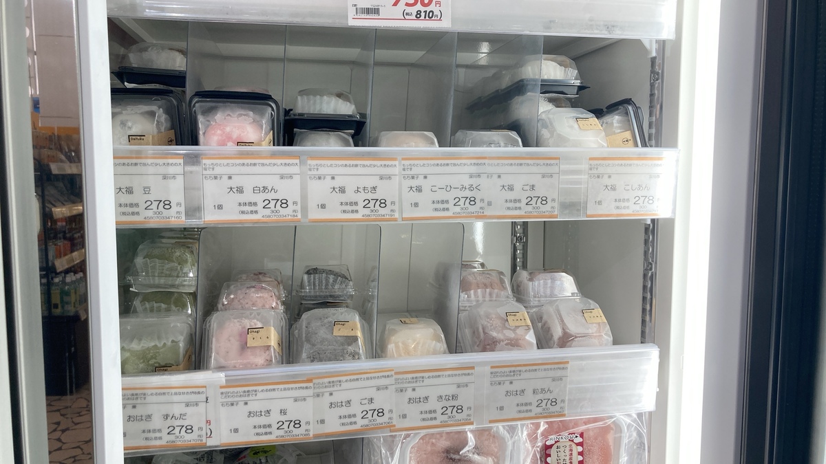 ここでは、人気の大福(豆・白あん・よもぎ・こーひーみるく・ごま・こしあん)や、おはぎ(ずんだ・桜・ごま・きな粉・粒あん)が冷凍で販売されています。