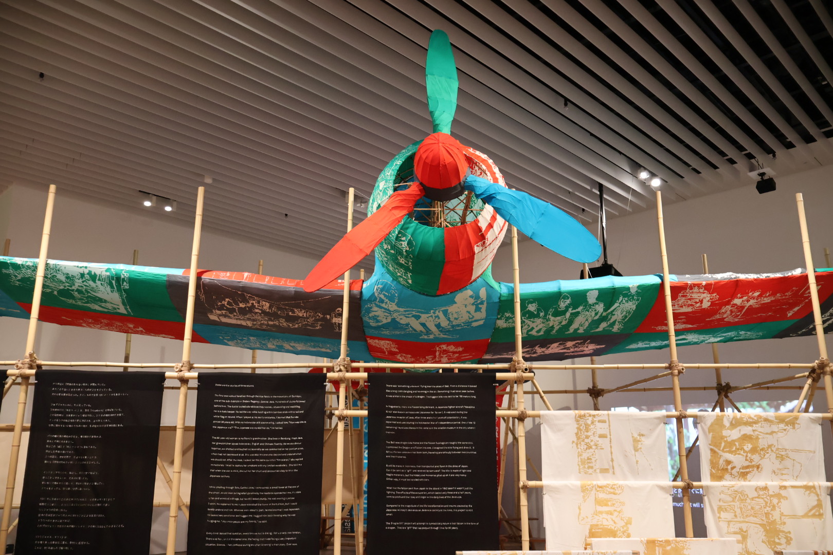 北澤 潤 《フラジャイル・ギフト:隼の凧》 2024年 竹、藤、印刷された布、紐 210×3,870×1,090 cm展示風景:「六本木クロッシング 2025 展:時間は過ぎ去る わたしたちは永遠」森美術館(東京)2025-2026 年 撮影:編集部