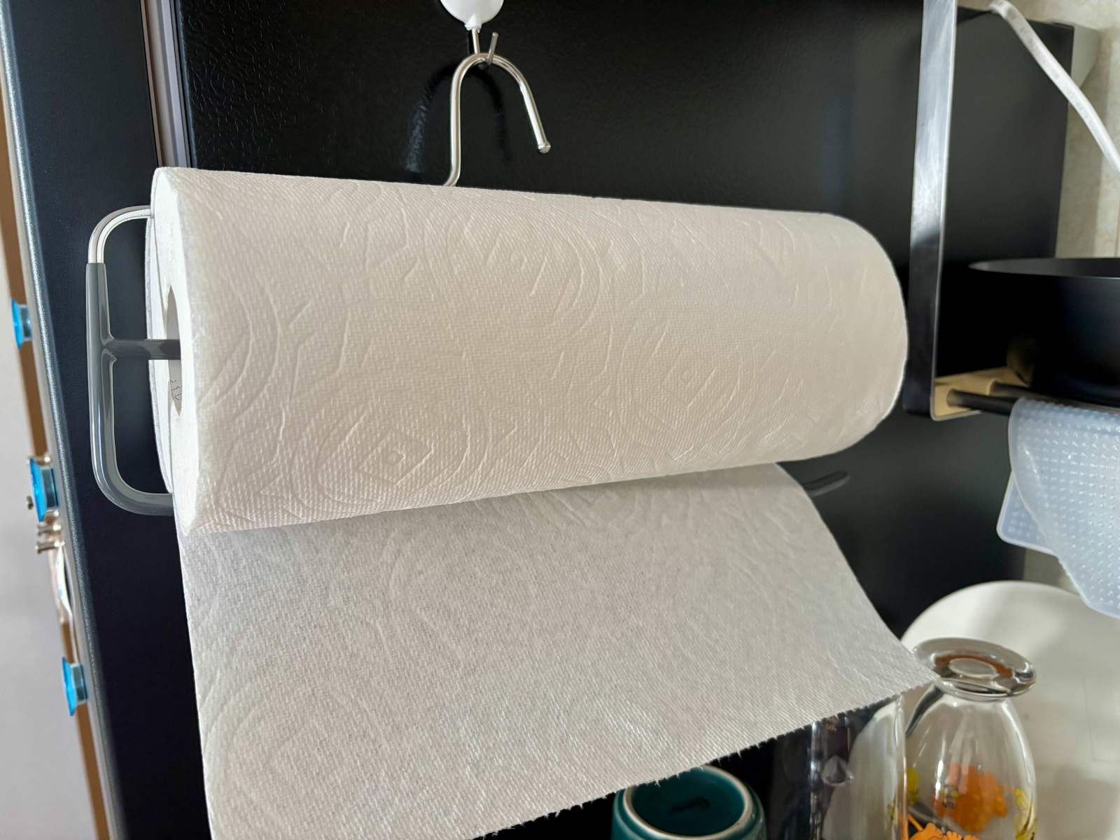 実際に使用すると、料理中でも片手でペーパーを引き出せ、作業効率が向上したように感じました。掛けるだけで設置も簡単。キッチン周りのスペースを取らず、便利に使えます。