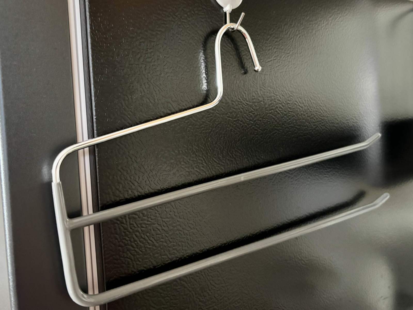 本来はスラックス用ですが、アイデア次第でさまざまな場所で活用できます。特にキッチンや洗面所での活用が便利で、空間を無駄なく使えるのが魅力です。軽量で持ち運びやすく、スチール製で丈夫なため、長く使える点もポイントです。