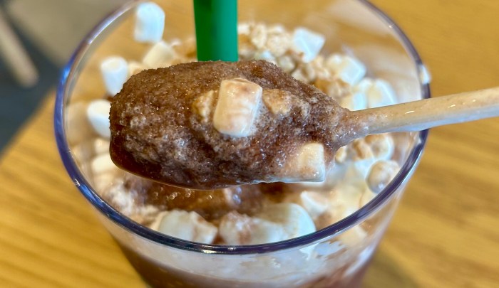 まずは『スモア チョコレート フラペチーノ(店内飲食税込690円)』だ。こちらはチョコレートソースの中にエスプレッソを加えたものがベース。ホイップの上にはスモア用ソース、マシュマロ、全粒粉入りのクランチ、ブリュレシュガーだ。こちら、混合液を使用しているためミルク変更は不可とのこと。