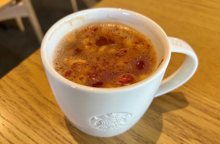 スチームしたアップルジュースに、シナモンやクローブ、オレンジ、クランベリーなどの風味を合わせ、さらにりんごとストロベリーのフリーズドライをトッピングしたもの。シナモン(+0円)が合う予感がしたので、トッピングしてもらった。
