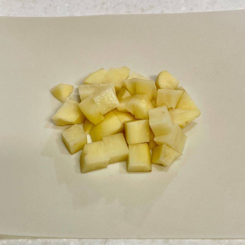 じゃがいもの皮をむき、サイコロ状にカットしましょう。