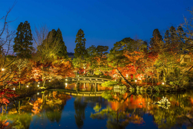 およそ3000本もの紅葉がライトアップされる夜間拝観のビュースポットは放生池。辺りの風景が水鏡に映り込む光景が圧巻です。