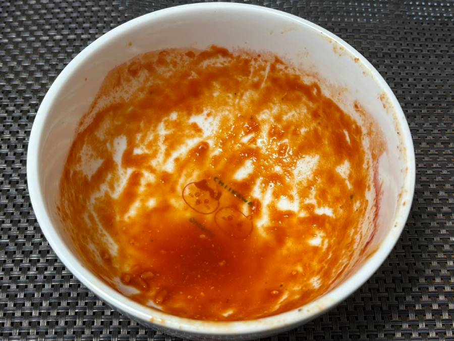 トマトジュース由来の濃厚な酸味がベースになり、縮れ麺と粉チーズがしっかり絡んで、風味とコクが完全にイタリアンのそれに様変わりしています。