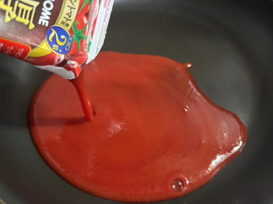 材料が準備できたら、まずはフライパンにトマトジュースと水を入れ加熱します。沸騰したら乾麺を投入。