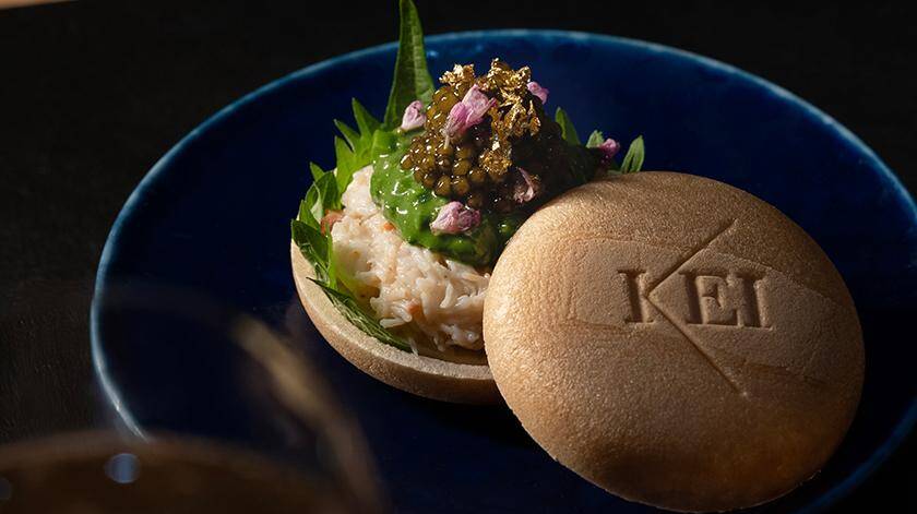 かわいらしい「クリームチーズのルーロー エディブルフラワーとナッツ&ドライフルーツ」。クリームチーズの酸味と、プチプチッとしたいちじくの食感、甘酸っぱいアプリコットの相性が抜群。