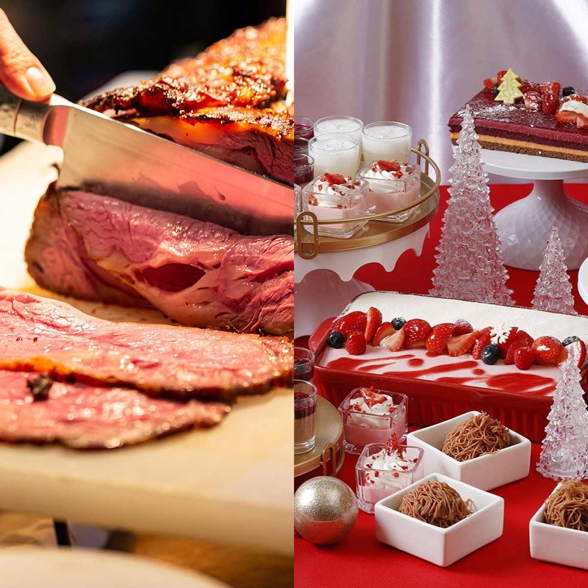 肉厚なローストビーフ、握りたてのお寿司、揚げたての天ぷら、さらに、クリスマスをモチーフにした料理やいちごが主役のスイーツもいただける、アニバーサリーイヤーにふさわしい超豪華ビュッフェ。