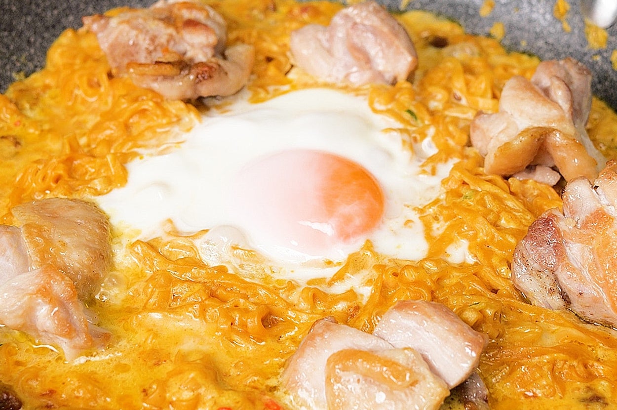 【インスタント麺で作るうまとろカレーボナーラ♡ワンパンで完成!】「一度作ると戻れない」「チーズと卵がとろけて優勝すぎる」
