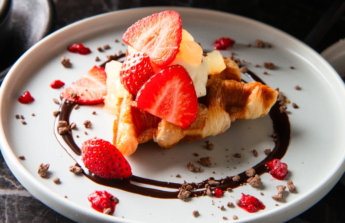 フランス産発酵バターのクロッフルは、バター香るサクサク食感のクロッフルと苺・チョコレート・アップルの相性が抜群のプレート。