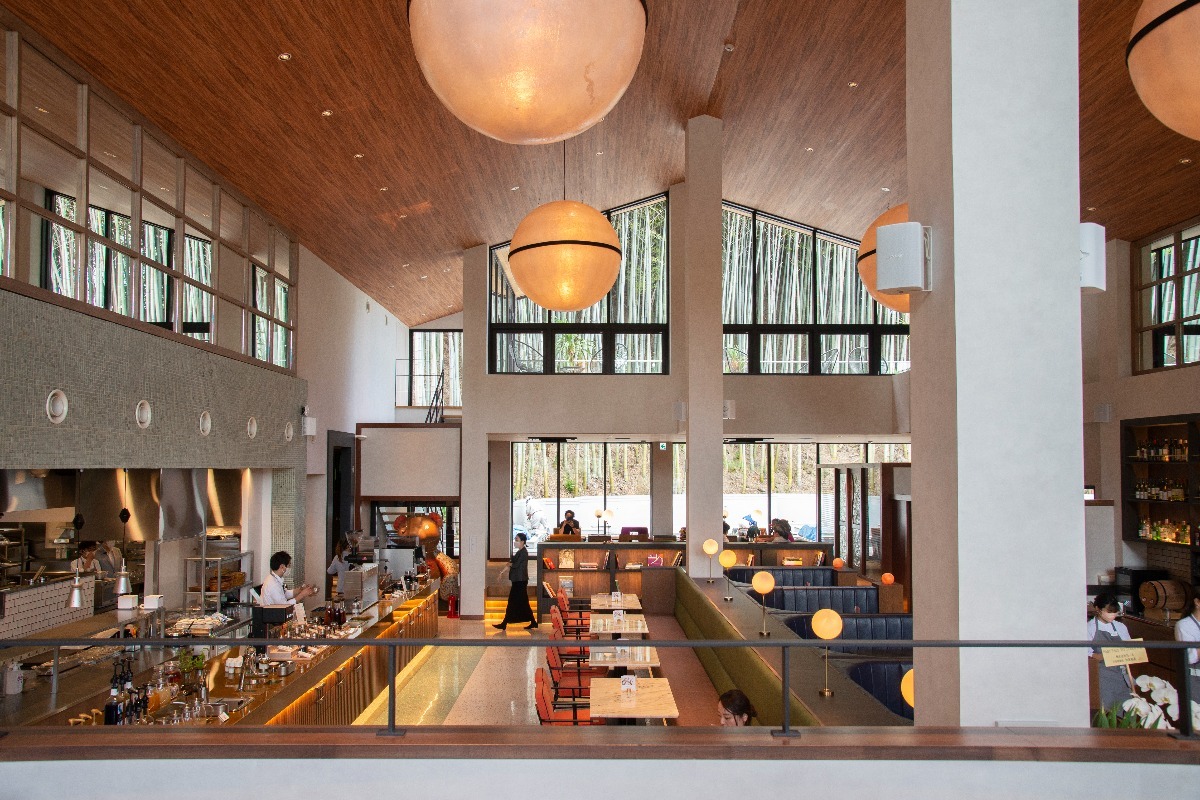 「日常から解放される場所」をコンセプトに、10mのビバレッジバーやライブキッチン、竹林を臨むスカイテラスとプールサイドデッキがあり、室内にいながら解放感満載。季節ごとに見せる竹林の風情も感じられ、運が良ければ鹿にあえることも。