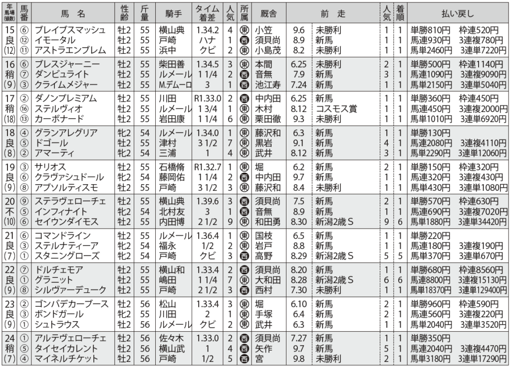 また①②人気が揃って馬券圏内に入ったケースは6回あり、どちらも条件を満たしていれば2頭軸マルチで狙う手もある。相手選びは消去法で進めたい。