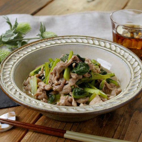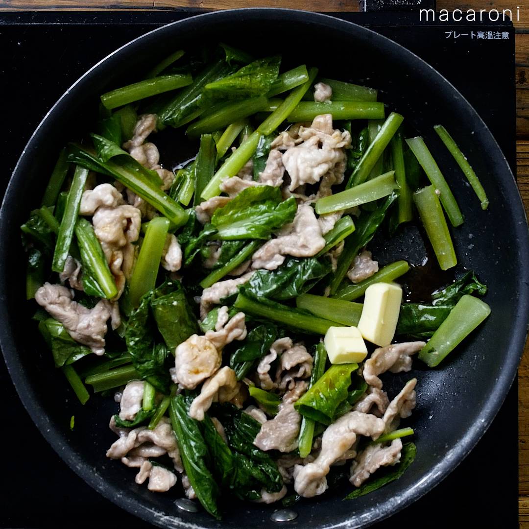 6: 残りのバター、ポン酢を加えて炒め合わせます。