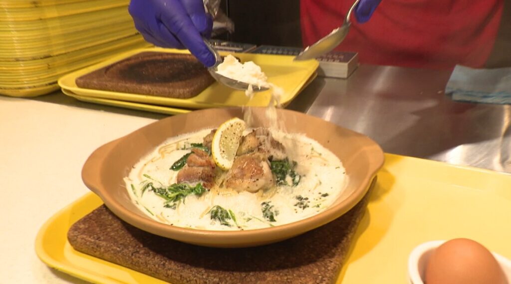 注文したのは人気の「レモン香るペッパーチキンのパルメナーラ」。席に持ってきてもグツグツと音を立てています。一口食べてみると、自家製の生パスタはモチモチ。クリームソースとよく合います。さらに黄身を割って混ぜると濃厚な味わいに。