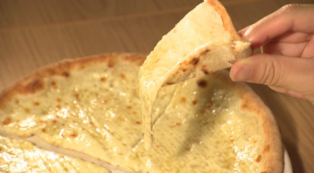 根強い人気のピザもあります。こちらは、生クリーム、ブレンドチーズ、そして、はちみつだけで味付けしたというシンプルなピザ。