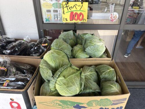 1玉100円のキャベツ!(先週は驚愕の50円だったそうです) しかもこのキャベツめちゃめちゃ重いので、中が詰まってます。