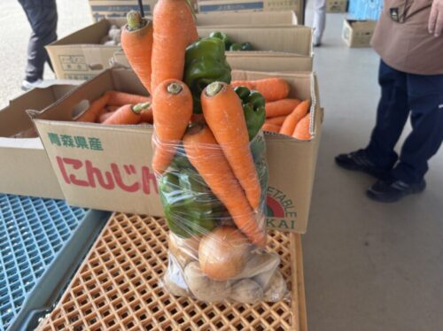 ドン!!!個数の内訳は、人参8本・ピーマン4個・玉ねぎ4個・ジャガイモ8個これだけはみ出しても、もちろんOK。 ちなみに店長さんに「まだまだはみ出さないと!」とお言葉をいただきまして、この形になりました(笑) 全種類詰め込むとこんな感じですが、人参1種類だとタワーができるらしいですよ! というわけで今回は「八百福堂 熊本うまかもん市場」のご紹介でした! ぜひ足を運ばれてはいかがでしょう!