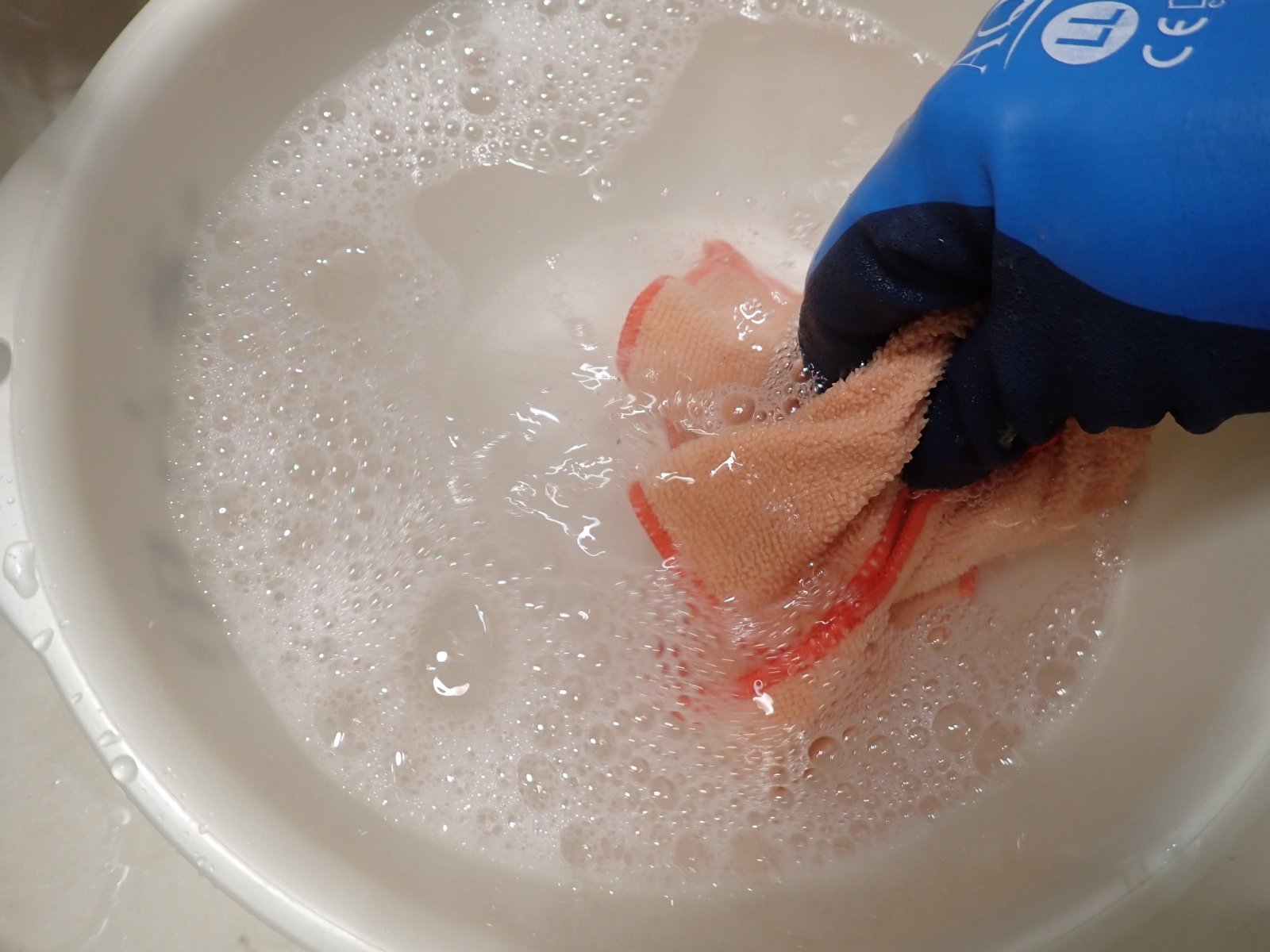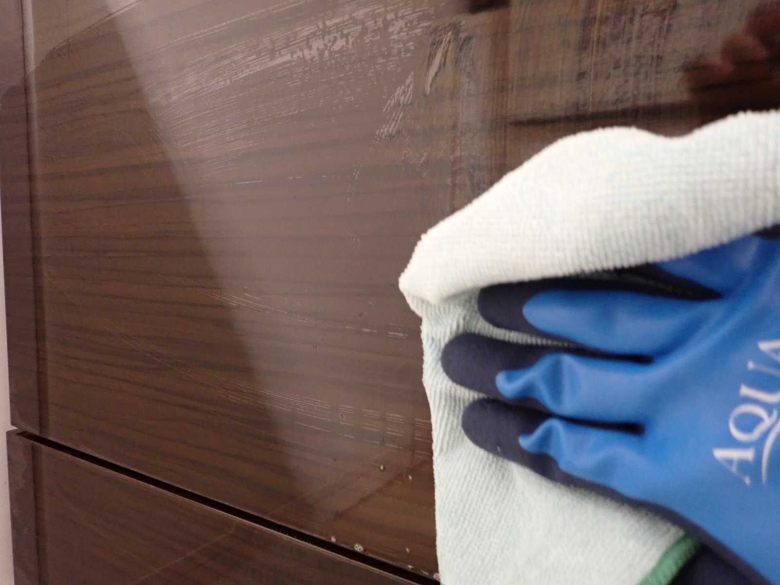 再度クロスを変えて、仕上げの乾拭きを行います。水滴が残るとムラ・白ジミ・再汚れ付着の原因になるので、最後は完全に乾かすイメージで!